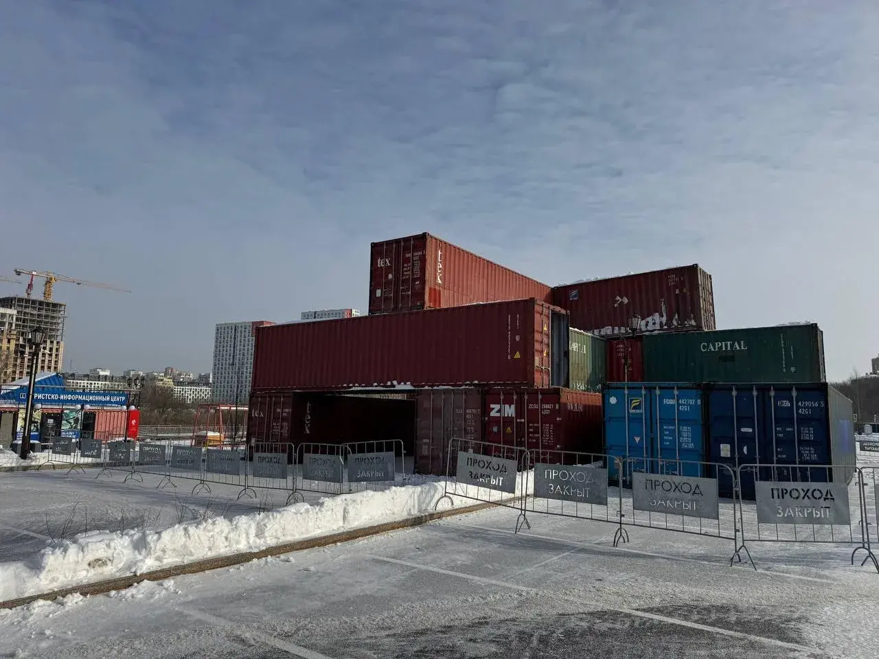 Основой конструкции стали 15 морских контейнеров, из которых создали уникальную трассу для джибб-контеста – дисциплины сноубординга, где райдеры выполняют трюки на различных фигурах и перилах.