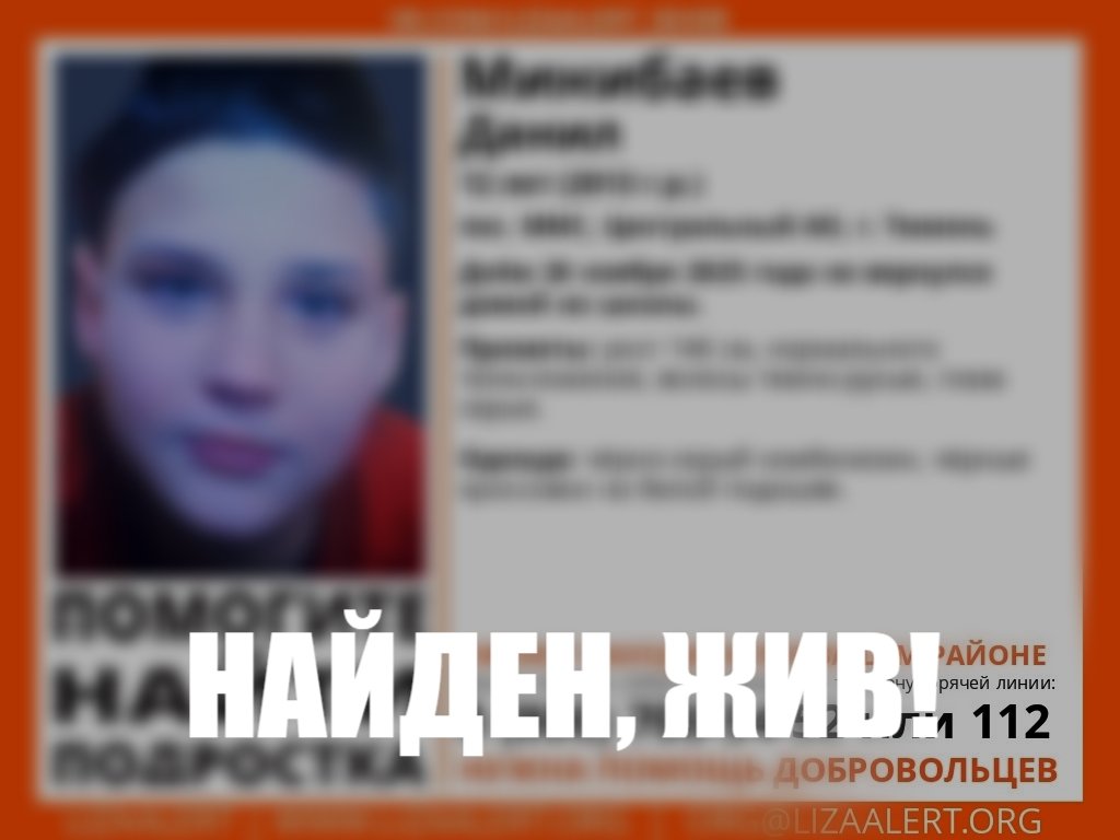 В Тюмени нашли 12-летнего Данила М.. Первый раз волонтеры поискового отряда «ЛизаАлерт» Тюменской области получили заявку на его поиск 19 ноября, когда мальчик ушел из дома в неизвестном направлении. Второе исчезновение произошло 26 ноября. Ребенок не вернулся со школы. Вечером 27 ноября поисковики сообщили, что подростка нашли живым и здоровым.