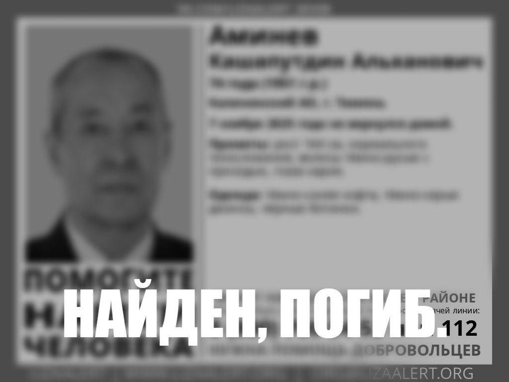 В Тюмени нашли погибшим рядом с теплотрассой 74-летнего Кашапутдина Аминева. К волонтерам поискового отряда «ЛизаАлерт» обратились ночью 9 ноября, но оказалось, что мужчина ушел по делам и не вернулся еще 7 ноября 2025 года.