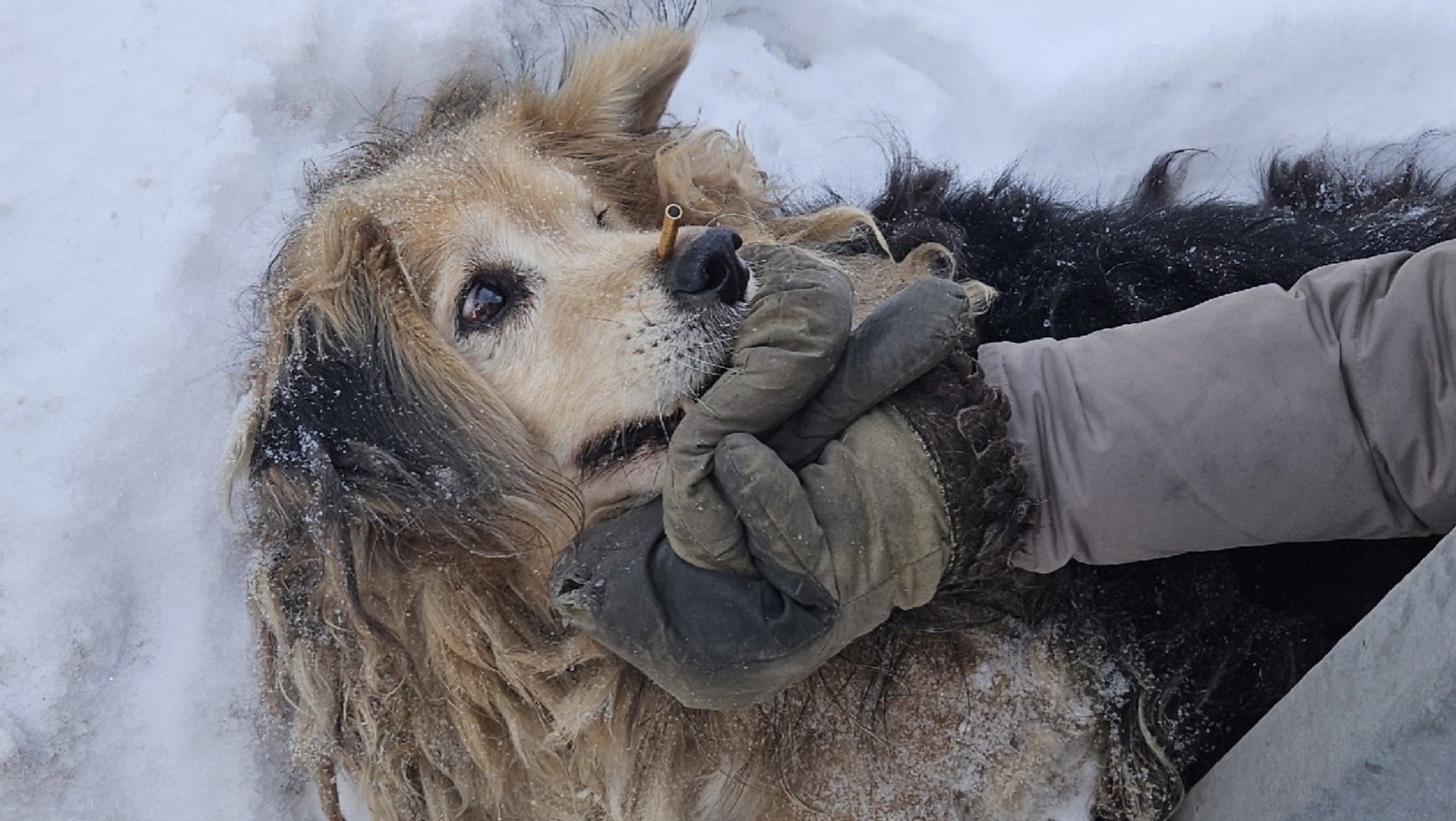 На улице волонтеры нашли собаку, истекающую кровью. Рядом лежали предметы, похожие на дротики или стрелы. Пес лежал в снегу, а люди проходили мимо. Сейчас песик жив и проходит лечение.