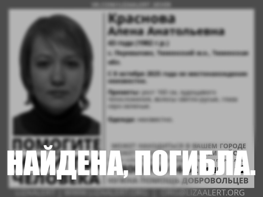 В селе Перевалово Тюменского района завершились поиски 43-летней Алены Красновой, пропавшей 8 октября. К сожалению, они обернулись страшной находкой – женщину убили. Об этом редакции «МегаТюмень» сообщил собственный источник.